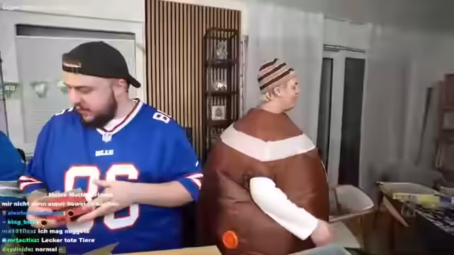 01:12:47Die Gruppe entdeckt Bud Spencer-Dosenwürstchen und diskutiert, ob dies eine Kulturlücke darstellt, da einige die Filme nicht kennen. Es folgt ein kurzer Exkurs über Comedy-Hobofilme und vegane Ernährung. Henke erhält den Auftrag, sich um den Sauerkrauts zu kümmern und orientiert sich an einem Rezept von Chefkoch. Kevin berichtet von seinen Erfahrungen in Chicago, während Reeze eine Anekdote über einen Zuschauer erzählt, der ihn in einem Club beim Urinieren in Biergläser beobachtet hat. Die Geschichte eskaliert, als ein Mädchen Klowasser aus einer Sprenkelanlage trinkt. Bei der Essenszubereitung gibt es technische Probleme mit dem Herd, und ein Topftausch wird erforderlich. Die Gruppe diskutiert über Restaurantbesuche mit Henke als Mitarbeiter und überlegt, welche Rolle er einnehmen würde. Es werden AI-generierte TikTok-Figuren erwähnt, und die Gruppe plant, später Nuggets als zweiten Gang zu servieren. Henke wird vom Chat kritisiert, weil er den Quark nicht richtig auskratzt, während die Gruppe über die Halftime-Show und vergangene Auftritte diskutiert.