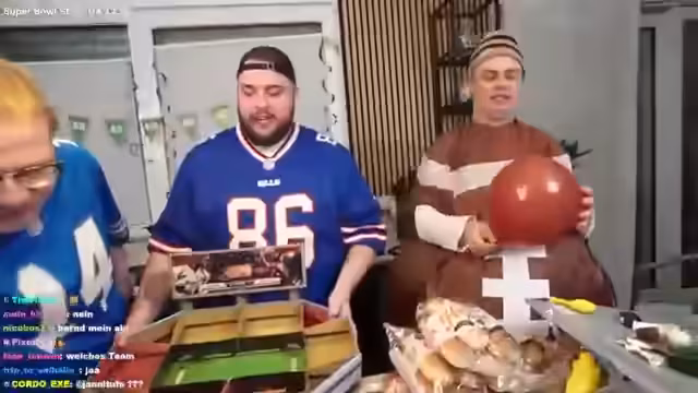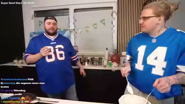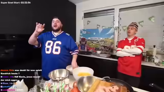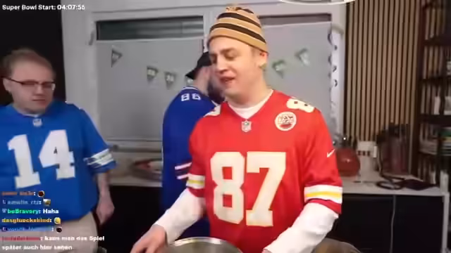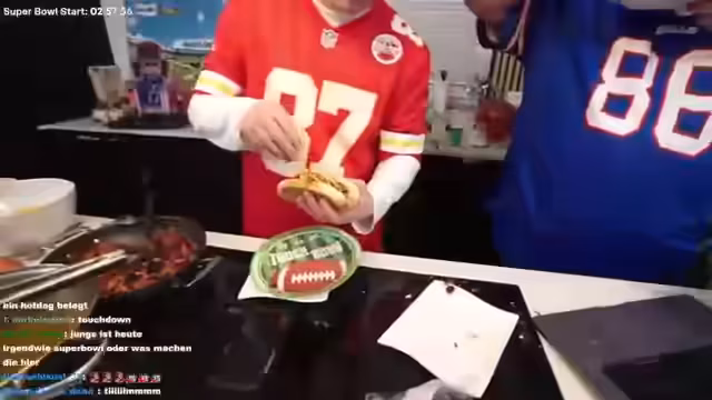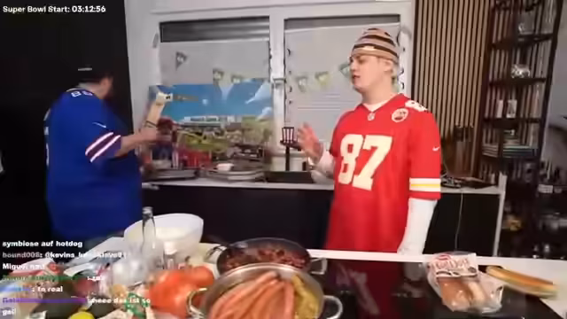 01:00:29Reeze erklärt seine Unterstützung für die Chiefs und neckt seine Freunde damit. Er präsentiert stolz das Snack-Stadion, das hauptsächlich aus Tortillachips besteht und mit verschiedenen Soßen gefüllt ist. Es gibt humorvolle Interaktionen über die Platzierung der Soßen und einen Käsesoßen-Unfall mit einem Polly Pocket Stift. Die Diskussion dreht sich um die Zubereitung von Hotdogs, wobei entschieden wird, ob vegetarische Würstchen separat gekocht werden sollen. Es folgt eine lebhafte Debatte über die Qualität und den Preis von vegetarischen Würstchen von IKEA, wobei unterschiedliche Meinungen ausgetauscht werden. Der Chat beteiligt sich aktiv an der Diskussion und gibt Tipps zur Unterscheidung der verschiedenen Würstchensorten. Reeze und seine Freunde bereiten sich auf das Super Bowl-Spiel vor, indem sie ein beeindruckendes Snack-Stadion kreieren und die Vorbereitungen filmen. Die Stimmung ist ausgelassen und voller Vorfreude auf das bevorstehende Ereignis.