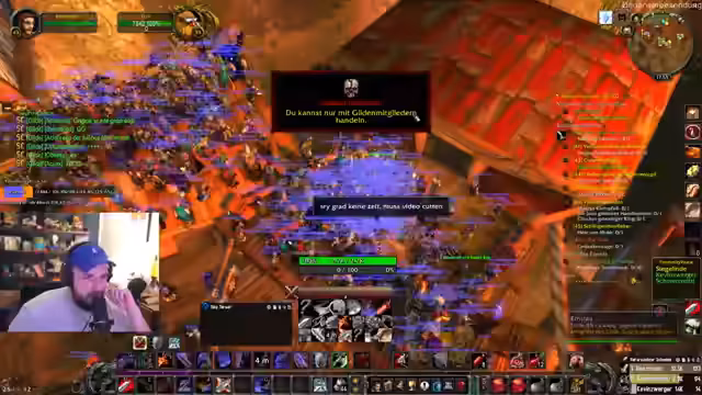 04:10:38Der Server leidet unter massiven Lag-Problemen, die das Gameplay nahezu unmöglich machen. Tausende von Spielern sind am Flugmeister gestrandet und können nicht landen. Der Streamer versucht verzweifelt, den World Buff zu holen, was durch den technischen Zusammenbruch erschwert wird. Die Gruppe überlegt, ob ein Aus- und Einloggen das Problem lösen könnte, was aber riskant ist. Trotz des Chaos will die Gruppe den Fortschritt nicht aufgeben und plant, die Buffs so schnell wie möglich nach Erhalt des World Buffs abzuholen und zum Zielort zu fliegen.