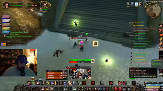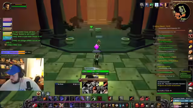 08:02:19Die Gruppe beginnt mit dem Dungeon Zul'Farrak, um Level zu erreichen. Es herrscht eine angespannte Atmosphäre, insbesondere beim Kampf gegen den Boss Akil'zon. Der Streamer äußert massive Todesangst und betont, wie schwer und gefährlich der Dungeon ist. Es kommt zu technischen Problemen, wie einer nicht ausschaltbaren Waffe, und die Kommunikation ist aufgrund von Mana-Problemen und Loot-Stress eingeschränkt. Die Gruppe diskutiert Strategien, um die Adds zu kontrollieren und den Boss sicher anzusprechen.