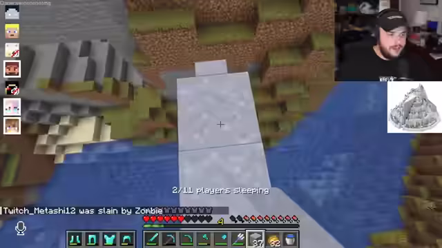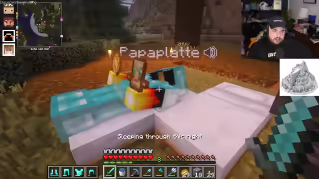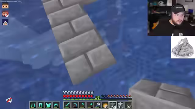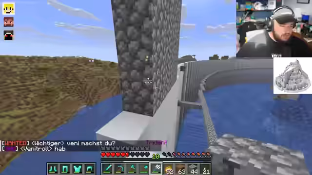 02:45:31Die Konzentration auf das Bauen wird durch die vielen Gespräche im Voice-Chat erschwert, was zu Fehlern führt. Der Streamer wechselt die Gruppe, um sich besser konzentrieren zu können. Es wird über ein verlorenes Bett und die Notwendigkeit von Feather Falling diskutiert. Der Streamer berichtet von einem „Gamer-Flashback“ aufgrund der Einrastfunktion der Maus. Ein gravierender Fehler im Mauerbau wird entdeckt: Es wurde der falsche Block (nicht Clay) verwendet, was massive Korrekturen erfordert. Es wird auch über die Zensur von Plattformen in China und die Blockierung von Google gesprochen.