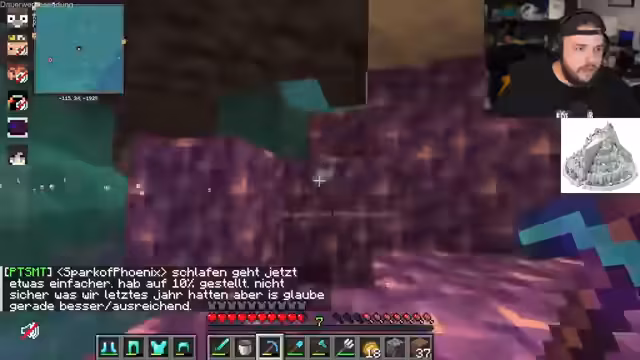 07:30:49Es entbrennt eine Diskussion über den Zugang zum Nether und End in CraftAttack. Kevin G-Time, ein anderer Teilnehmer, plant, seinen gesamten Nether-Hub im Nether zu bauen und müsste anderthalb Wochen warten, wenn der Nether-Zugang verschoben würde. Der Streamer äußert Bedenken, G-Time dies anzutun. Es wird vorgeschlagen, den Nether-Zugang beizubehalten, aber den End-Zugang zu verschieben, um zu verhindern, dass alle Spieler zu schnell mit Elytren herumfliegen. Dies wird als positives Handicap angesehen, da es das Spielgeschehen verlangsamt und für alle fairer macht. Die aktuelle langsame Spielweise wird als gut empfunden, obwohl der Verzicht auf Quarz und andere Materialien für Redstone-Konstruktionen stressig ist. Es wird scherzhaft erwähnt, dass Jokecraft bereits zittert, da er ohne Quarz keine Komparatoren herstellen kann.