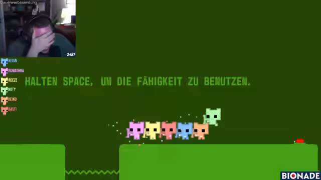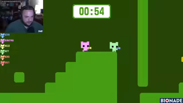 03:41:34Die Gruppe ringt um koordinierte Bewegungen in Pico Park. Es kommt häufig zu Missverständnissen bei der Farberkennung, besonders bei Heiko, der die Farben nicht unterscheiden kann. Die Streamer versuchen, eine Formation zu bilden, stoßen aber auf Probleme bei der Umsetzung. Ein User schlägt vor, dass die Gruppe sich wie eine Kette aufstellen soll, um besser durch das Level zu kommen. Die Kommunikation erfolgt überwiegend durch Anweisungen wie nach links/rechts laufen, sich ansaugen oder springen, was teilweise zu chaotischen Szenen führt.