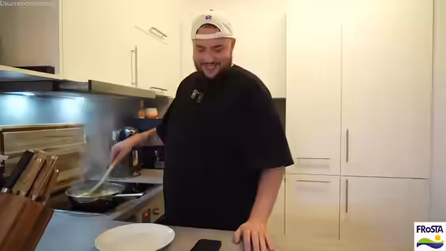 00:58:35Zunächst gibt es technische Schwierigkeiten mit dem Ton, der knistert. Es wird versucht, das Problem zu beheben, indem verschiedene Einstellungen und Anschlüsse überprüft werden. Nach einigen Tests scheint der Ton besser zu sein. Danach erfolgt der Wechsel in die Küche, um mit der Zubereitung von Fischstäbchen zu beginnen. Es wird angekündigt, dass es ein Frosta Giveaway geben wird und die Zuschauer abstimmen dürfen, welches Gemüse zu den Fischstäbchen zubereitet werden soll. Zur Auswahl stehen Gemüsepfanne à la Provence, Gemüsepfanne Sommergarten und Papardelle Creme Spinacci. Die Zuschauer entscheiden sich mehrheitlich für die Papardelle Creme Spinacci. Die Fischstäbchen werden auf einem Backblech platziert, wobei Wert auf eine ordentliche Anordnung gelegt wird, und in den Ofen geschoben. Ein Timer wird gestellt. Die Zubereitung der Papardelle Creme Spinacci beginnt.