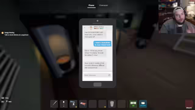 02:08:33Nach der Flucht aus dem Tutorial beginnt die Charaktererstellung, bei der die Spieler großen Wert auf ein möglichst abstoßendes Aussehen legen, um den Drogenkonsumenten ein abschreckendes Bild zu bieten. Nach der Charaktererstellung stellt sich heraus, dass sie 100 Dollar auf der Kreditkarte und kein Bargeld besitzen. Es wird die Map freigeschaltet. Der Fokus liegt nun darauf, mit Uncle Nelson am Payphone zu sprechen, um Anweisungen zu erhalten. Dieser teilt mit, dass er Cash in der Stadt versteckt hat, und zwar in der Nähe des Town Hall Fountains im Kennel hinter dem Supermarkt. Die Spieler machen sich auf die Suche nach dem Supermarkt, wobei sie die Map nutzen und Kunden aufspüren. Am vermeintlichen Kanal wird jedoch kein Geld gefunden, stattdessen wird ein Obdachloser angetroffen. Schließlich werden mehrere Dead Drops entdeckt, an denen insgesamt 375 Dollar gefunden werden können. Während der Geldbeschaffung kommt es zu einer Explosion, die von einer rivalisierenden Gang, TB, verursacht wurde, die ihr Territorium markiert.