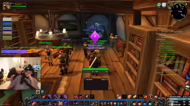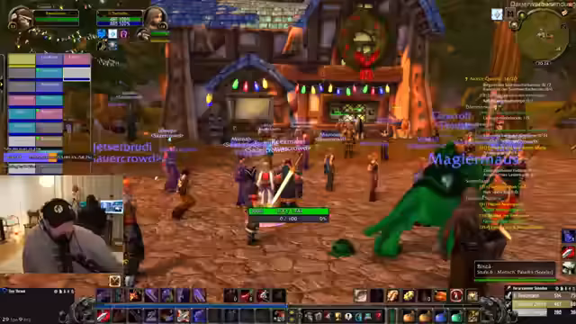 01:43:59Der Stream enthält längere, humorvolle Abschweifungen, die nicht direkt mit dem Gameplay zusammenhängen. Dazu gehören die fantasievolle Idee, ein automatisches Bewässerungssystem für Streams zu entwickeln, das auf Schlüsselwörter reagiert, sowie ein Gespräch über die korrekte Aussprache des Ortsnamens 'Gadgetzan'. Parallel dazu werden technische Probleme wie Lags erwähnt, die einen Neustart des gesamten PC erforderten, während gleichzeitig ein Weak-Aura-Add-on als mögliche Ursache vermutet wird.