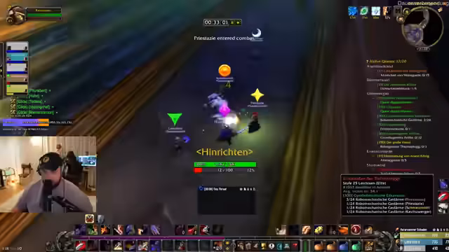 02:15:17Das Gameplay konzentriert sich auf das AOE-Agremanagement (Area of Effect) und den Grind von Quests. Der Streamer betont die Wichtigkeit, Aggro zu kontrollieren, um das Überleben des Teams zu sichern. Gleichzeitig werden Missverständnisse und Kommunikationsprobleme deutlich, als ein Spieler für das Auflösen der Gruppe verantwortlich gemacht wird und es zu einem Verwirrspiel kommt, wer welchen Mob angreift und lootet.
