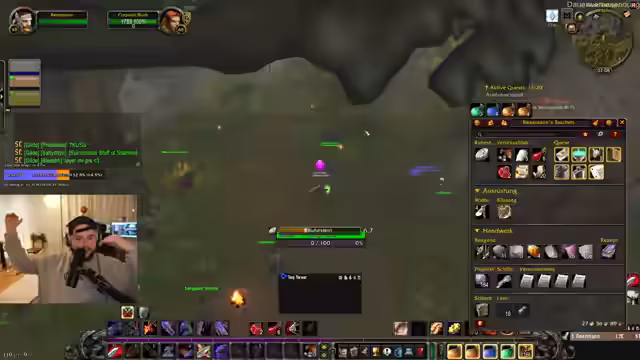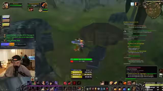 08:01:47Nach dem turbulenten Vorfall wird das Gameplay nahtlos fortgesetzt. Streamer kehrt zu seinen Quests zurück, gibt diese in Ironforge und Booty Bay ab und fliegt anschließend nach Dämmerwald, um seine Krieger-Quest fortzusetzen. Der Zwang, für herzustellende Items wie Gifte die Bank aufzusuchen, wird als umständlich und stressig beschrieben. Es wird erwähnt, dass seit Beginn des Projekts noch kein Spieler gestorben ist und das Ziel, Level 60 zu erreichen, als sehr herausfordernd gilt.