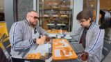 03:27:12Die Spieler setzen sich im Laden nieder, um Baklava und türkischen Tee zu bestellen und vor Ort zu verkosten. Es gibt eine große Vielfalt an Sorten, von klassischen bis zu Schoko-Baklava. Die Bestellung umfasst ca. 80 Stück Baklava sowie Börek-Stangen. Während des Essens werden die Preise als fair und die Produkte als lecker bewertet, und der Laden erhält einen Shoutout.