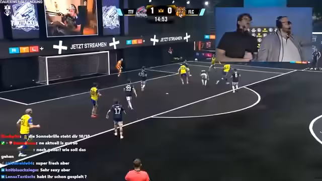 07:49:48Das Spielgeschehen ist extrem spannend und von hoher Intensität geprägt, was sich in der emotionalen Reaktion des Streamers und des Chats äußert. Es gibt eine kurze Unterbrechung, weil eine Lampe über dem Spielfeld herunterhängt und ein Sicherheitsrisiko darstellt. Der Streamer schlägt humorvoll vor, die Lampe mit einer Drohne zu entfernen. Die Taktik des Teams wird versehentlich von Wieland verraten, was zu Besorgnis führt. Trotz der Herausforderungen und Rückschläge ermutigt der Streamer das Team, ruhig zu bleiben und sich auf das Spiel zu konzentrieren. Die erste Hälfte endet mit einem Stand von 3:3 nach einer Phase des 1-gegen-1 mit Torwart, die der Streamer als "CoinFlip" bezeichnet.