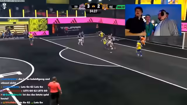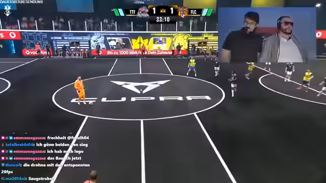 06:51:55Das Spiel steht kurz vor einem Platzsturm, da die Gemüter hochkochen. Ein Spieler hat versehentlich das LED-Panel von Vodafone beschädigt. Die Tiki Takas zittern, und es wird ein krasser Save gezeigt. Es gibt Unterstützung aus Österreich für G2. Die T-Chicken-Flagge wird erwähnt. Ein Spieler äußert, dass das Spiel bisher etwas langweilig ist. Es wird überlegt, wie man eine Vorrichtung bauen könnte, um den Ball mit Elektromagneten zu steuern. Einer der Team-Präsidenten findet das Spiel bisher langweilig, was die Spieler auf der Bank zusätzlich motivieren soll. Beide Teams zeigen Angst, was das Spiel beeinflusst. Es gibt zwei Bälle auf dem Platz. Es wird überlegt, wer für einen Shootout ausgewählt werden sollte. Die Futbolistas haben die Überhand, und es werden lustige Teamnamen verglichen. Die Stimmung vor Ort ist voller Adrenalin, was die Anspannung erhöht. Es wird diskutiert, ob das Spiel geskriptet ist oder nicht.