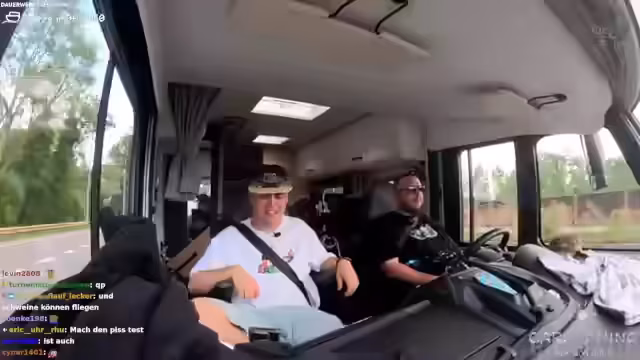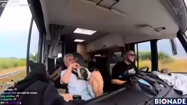 00:32:00Der Stream lebt von der lockeren Stimmung im Konvoi und der Interaktion mit den Zuschauern. Themen reichen von der Vorliebe für Falafel über Englische Essenskultur bis zu humorvollen Vorhersagen, wer sich auf der Tour einmal verletzt oder hinfallen könnte. Auch persönliche Anekdoten, wie der Besuch von Revils Festival-Set, unterhalten das Publikum während der Fahrt.