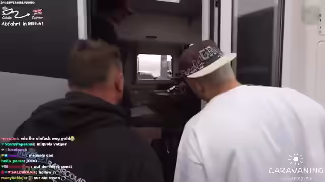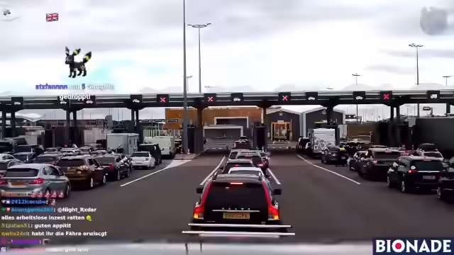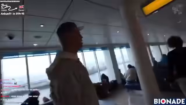 05:17:03Die Passkontrolle verläuft holprig. Miguel hat aufgrund seines schlechten Englischs Schwierigkeiten, und auch Tim sorgt für Verwirrung, als er am Schalter falsch verstanden wird. Der Ton des Streamers wird angespannt, und er fragt im Chat rhetorisch, ob jemand eine Waffe bei sich hat, was die angespannte Situation illustriert. Die Fähre scheint jedoch kurz davor zu sein, abzulegen.