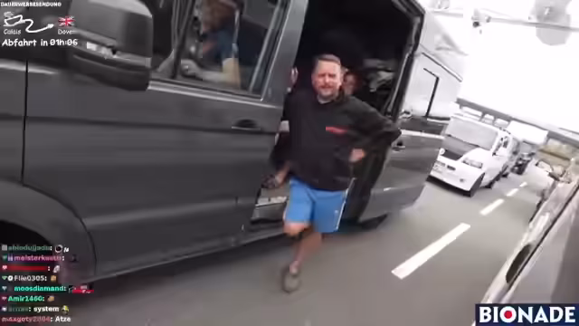 08:52:57Die Ankunft in Großbritannien gestaltet sich chaotisch. Der Streamer ist mit der Linksverkehrsituation überfordert und muss sich erst an die ungewohnte Fahrspur gewöhnen. Gleichzeitig bereitet das Überleben des AdBlue-Vorrats Probleme, der kurz vor dem Leerstand steht, was einen sofortigen Halt an einer Tankstation erfordert. Trotz der chaotischen Umstände ist die Stimmung gelöst und die Freude über die erfolgreiche Ankunft und die vorerst gelöste technische Hürde am Fahrzeug spürbar.