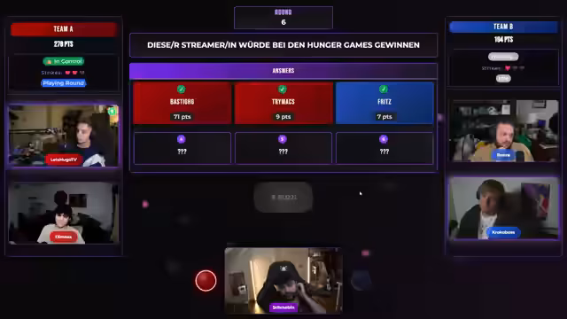 03:03:36Die fünfte Runde des Chat-Duells fragt, was auf einem Burger nicht fehlen darf, und die Teilnehmer nennen Patty, Käse, Buns, Soße und Salat. Die Herausforderung besteht darin, die beliebtesten Zutaten zu erraten, die der Chat ausgewählt hat. Die letzte Runde befasst sich mit der Frage, welcher Streamer bei den Hunger Games gewinnen würde. Die Teilnehmer nennen Fritz Meineke und Basti, wobei Basti mit 100% Zustimmung die populärste Antwort ist. Die Spieler müssen ihre Kenntnisse über Streamer-Persönlichkeiten und deren Eigenschaften einsetzen, um die Antworten des Chats zu antizipieren und das Spiel zu gewinnen.
