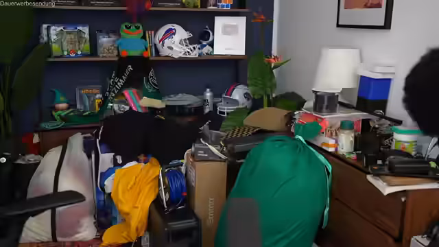 00:17:05Der Streamer präsentiert stolz Werbegeschenke von der Website thelockerroom.com, darunter einen originalgroßen Buffalo Bills Helm, eine Grillschürze, einen Pizzaschneider und Buffalo Bills Becher. Er freut sich über die Geschenke und probiert den Helm an, stellt jedoch fest, dass es sich um eine Replika handelt, die nicht als Schutzhelm getragen werden sollte. Dies führt zu einer humorvollen Einlage, in der er den Helm aufsetzt und sich vorstellt, wie er damit auf dem Spielfeld wirken würde. Anschließend geht er eine Wette mit dem Chat ein: Wenn er sein Zimmer nicht bis zum 1. November aufgeräumt hat, verspricht er, 100 Subs an die Community zu verschenken. Dies sorgt für Unterhaltung und Interaktion mit den Zuschauern.