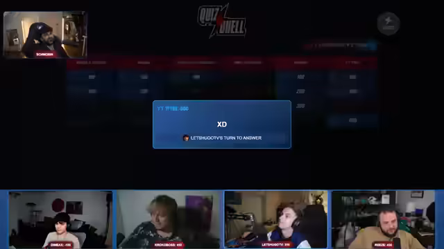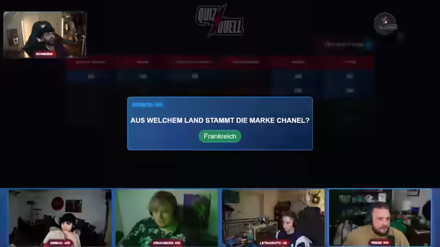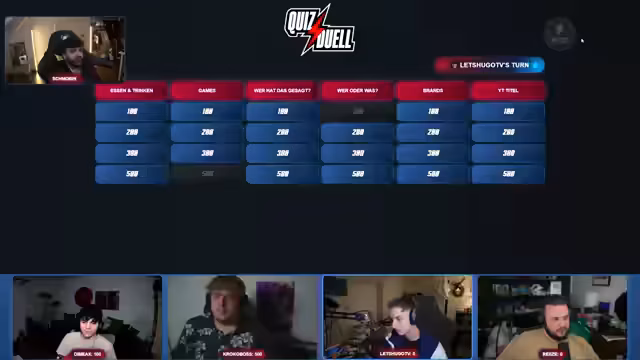 01:02:41Schmobbin erklärt die Regeln des Quizduells: Die Teilnehmer wählen abwechselnd eine Kategorie aus, wobei 100 Punkte leichtere und 500 Punkte schwerere Fragen bedeuten. Es gibt zwei Boards, wobei das zweite Board doppelte Punkte vergibt. Bei einer falschen Antwort werden die Hälfte der Punkte abgezogen, und andere Spieler können buzzern, um die Frage zu beantworten und ebenfalls die Hälfte der Punkte zu erhalten. Dima beginnt mit der Kategorie „Wer oder was 100“ und beantwortet die Frage nach dem Krokodil korrekt. Coco wählt „Games 500“ und beantwortet die Frage nach der Anzahl der nummerierten Hauptteile von Final Fantasy mit 16, was korrekt ist. Reese wählt „YouTube-Titel 300“ und muss den Urheber eines Titels mit Tippfehlern erraten, scheitert jedoch, was zu Punktabzug führt.