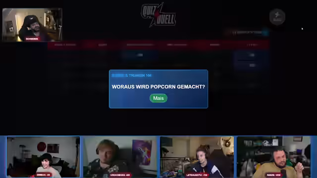 01:22:56Die Gameshow erreicht eine Phase mit vermeintlich einfacheren Fragen aus den Kategorien Games, Brands und Essen & Trinken. Die Frage nach den Impostoren in Among Us und der Marke, die Flügel verleiht (Red Bull), werden schnell und korrekt beantwortet. Eine Frage nach der Herstellung von Popcorn führt zu einer amüsanten Diskussion über die Begriffe 'Korn' und 'Mais'. Ein Teilnehmer überrascht mit einer detaillierten, wenn auch teilweise fehlerhaften, Erklärung zur Namensherkunft von Naruto Uzumaki, die für Unterhaltung sorgt. Diese Phase ist eine Mischung aus schnellen Antworten und unerwarteten, humorvollen Erklärungen.