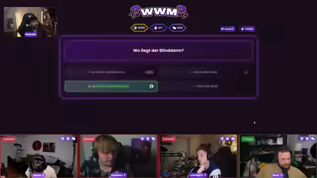 01:52:46Das neue Quiz-Format beginnt mit Fragen zum Allgemeinwissen, die schnell beantwortet werden, wie die nach dem Zubehör eines Computers (Maus). Die Schwierigkeit steigt jedoch schnell an, mit Fragen zu Familienbeziehungen ('Urgroßvater') und nautischen Begriffen ('versteuert'). Eine Frage zur überfrierenden Nässe (Blitzeis) führt zu einer Diskussion über die genaue Definition. Die Teilnehmer kämpfen mit der Anatomie des Blinddarms und chemischen Elementen. Die Stimmung ist eine Mischung aus Konzentration, Frustration über knifflige Fragen und gelegentlichem Humor, während die Punktevergabe voranschreitet.