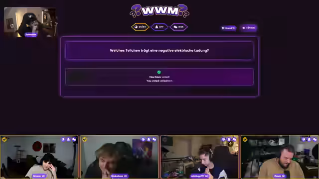 02:13:00Die Gameshow nähert sich der Halbzeit mit Fragen aus den Bereichen Film und Physik. Der Bösewicht aus 'The Dark Knight' (Joker) und das Teilchen mit negativer elektrischer Ladung (Elektron) werden abgefragt. Die Teilnehmer diskutieren über die Joker-Nutzung und die strategische Bedeutung, diese für spätere Runden aufzuheben, in denen mehr Punkte vergeben werden. Es kommt zu weiteren humorvollen Einlagen und Diskussionen über die Richtigkeit der Antworten. Die Spannung steigt, da die Teilnehmer versuchen, ihre Punkte zu maximieren und sich für die späteren, punktereicheren Fragen zu positionieren.