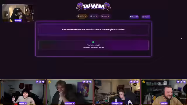 02:19:38Die Quizrunde geht weiter mit Fragen zu verschiedenen Themen. Eine Frage nach dem Erschaffer von Sherlock Holmes führt zu humorvollen Spekulationen und dem Einsatz von Jokern. Die Spieler versuchen, die Antworten durch logisches Denken oder Ausschlussverfahren zu finden, wobei auch auf popkulturelles Wissen, wie Anime, zurückgegriffen wird. Die Spannung steigt, da die Anzahl der verbleibenden Joker und Runden begrenzt ist. Eine Frage nach dem Gemälde 'Das letzte Abendmahl' sorgt für Verwirrung, bis die richtige Antwort gefunden wird. Die Spieler müssen taktisch vorgehen, um ihre Joker optimal einzusetzen und im Spiel zu bleiben.