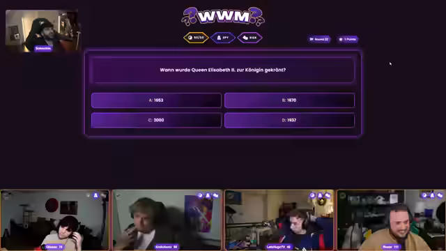 02:26:15Das Quiz testet weiterhin das Allgemeinwissen der Teilnehmer mit Fragen aus der Popkultur, wie zum Beispiel nach einem Nintendo-Spiel, in dem Rosalina vorkommt. Die Spieler überlegen, wie sie am besten spionieren oder ihre Joker einsetzen können, um die richtige Antwort zu finden. Eine historische Frage nach einer antiken Stadt, die durch den Vesuv zerstört wurde, bringt die Teilnehmer dazu, ihr Wissen über alte Zivilisationen zu aktivieren. Die Spannung bleibt hoch, da jeder Fehler die Rangliste beeinflussen kann. Die Mischung aus verschiedenen Wissensgebieten macht das Quiz abwechslungsreich und herausfordernd für alle Beteiligten.