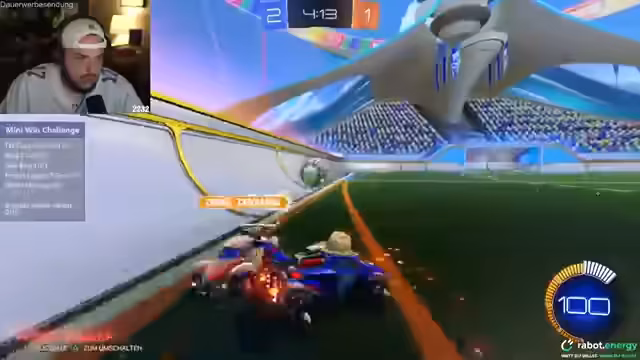 00:24:00Streamer startet mit Rocket League und muss fünf Tore schießen. Er beschreibt sich selbst als todesscheiße in diesem Spiel und befürchtet, dass dies bis zu vier Stunden dauern könnte. Während des Spiels treten technische Probleme auf, unter anderem unerwünschte Pop-up-Fenster von Autodesk und Epic Games. Trotzdem gelingt es ihm nach mehreren Versuchen, sein erstes Tor zu schießen, was als großer Triumph gefeiert wird. Er zeigt sich beeindruckt von der Leistung eines jüngeren Gegners, der ihm Paroli bietet.