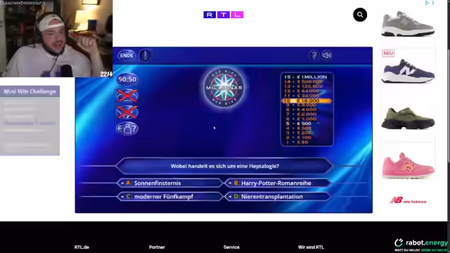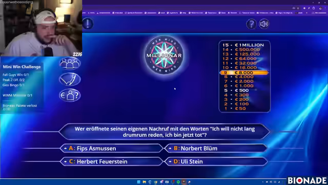 01:45:20Nachdem die Fall Guys Challenge gescheitert ist, wechselt Streamer zu Wer wird Millionär? Er muss versuchen, auf die Million zu kommen, um die Challenge zu bestehen. Während des Spiels macht er sich eine Pause, isst belegtes Brot und redet mit dem Chat. Er zeigt sich frustriert von der Fall Guys Erfahrung, ist aber entschlossen, die nächste Challenge zu meistern. Er startet das Spiel, muss aber zunächst Werbung ansehen, was er als völlig krank bezeichnet.