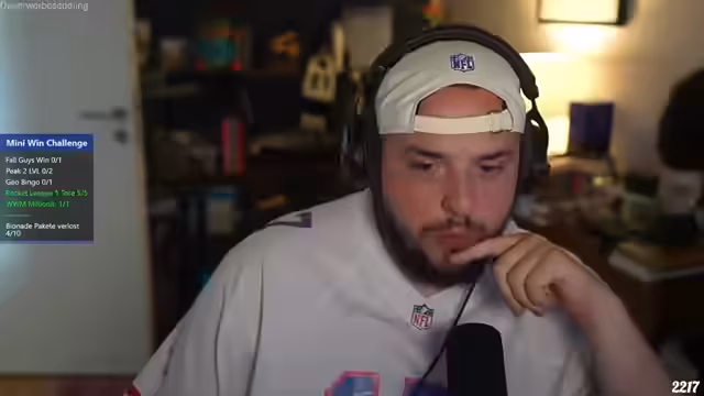 00:17:59Streamer stellt eine Mini-Win-Challenge vor mit fünf verschiedenen Spielen, darunter Fall Guys, Peak, Geo-Bingo, Rocket League und Wer wird Millionär. Nach jeder geschafften Challenge werden zwei Bionade-Pakete an die Community verlost. Herausforderung besteht darin, bis spätestens 19:30 Uhr alle Spiele zu absolvieren. Streamer ist wegen später Pokerverabredung unter Zeitdruck und muss todes-crazy in die Spiele reinbrainen.
