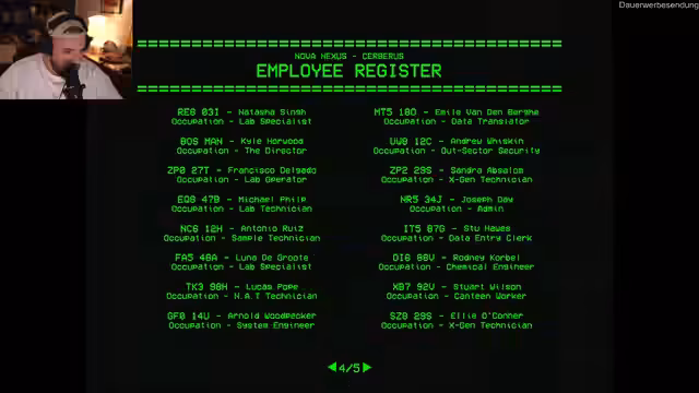 05:14:32Nachdem das grundlegende Spielprinzip verstanden ist, versucht der Streamer, die tiefere Story des Spiels zu entschlüsseln. Er entdeckt, dass die Nova Nexus Company gefährliche paranormalen Experimente durchführt. Nach und nach werden Hinweise auf ein Portal und ein katastrophales Experiment, bei dem Mitarbeiter getötet wurden, sichtbar. Eine zentrale Figur in dieser Geschichte ist eine Mitarbeiterin namens Natascha Singh, die durch das Portal ging und dabei starb. Der Streamer spekuliert über verschiedene Strategien, um alternative Enden freizuschalten, indem er bestimmte Personen wie Natascha oder andere Verdächtige ablehnt.