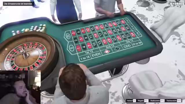 00:50:59Während auf die restlichen Mitspieler gewartet wird, widmen sich die Anwesenden dem GTA-Casino, um schnell an Geld zu kommen. Gemeinsam spielen sie 3-Card Poker und Roulette. Dabei nutzen sie erfolgreich Freespins und sammeln durch geschicktes Setzen und Halten bei Blackjack eine beachtliche Menge an Chips, die sie in Spielgeld umtauschen. Das Ziel ist es, sich das notwendige Startkapital für den anstehenden Heist zu erspielen, anstatt es mit echtem Geld zu kaufen oder es von einem angeblichen Hacker anzunehmen.