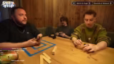 00:49:31Das dritte Spiel heißt 'Treppensack'. Hierbei werfen die Teams abwechselnd Sack auf eine Treppe. Ein Punkt zählt nur, wenn der Sack auf einer Treppenstufe liegen bleibt und nicht herunterfällt. Die Runde wird im Modus 'Best of Five' gespielt, was den Druck erhöht. Die Streamer, insbesondere Wieland, haben trotz einer gebrochenen Rippe zu kämpfen, was die Anspannung zusätzlich steigert. Team Schwabenland dominiert das Spiel und geht früh in Führung.