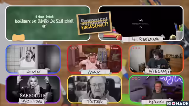 02:15:04Nach der Erklärung der Metaphern beginnt eine Quizrunde, die die Teilnehmer von der 7. bis zur 9. Klasse führt. Die Fragen decken verschiedene Fächer wie Mathe, Sachkunde, Deutsch und Naturwissenschaften ab. Ein wiederkehrendes Element ist das "Spicken", bei dem Teilnehmer versucht sind, sich von Mitschülern die Antworten abzuschreiben. So wird beispielsweise Kevin bei einer Geschichtsfrage erwischt, als er eine falsche Antwort von Heiko kopiert und dafür eine 6 kassiert. Der Streamer agiert dabei als eifriger, aber leicht überforderter Lehrer.