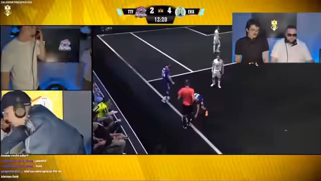 04:12:30Das Spiel beginnt und die Streamer kommentieren das Spielgeschehen intensiv. Es geht hin und her, und es gibt Tore und Abseitsentscheidungen, die die Spannung hochhalten. Das Team ist motiviert, aber auch frustriert über einige Schiedsrichterentscheidungen. Die Streamer werden emotional und müssen sich manchmal zurückhalten, nicht zu aufgeregt zu werden. Die Zuschauer interagieren stark im Chat und feuern ihre Teams an. Die Teams kämpfen verbissen um den Sieg, und es ist noch alles offen in der Partie.