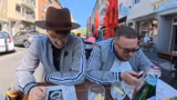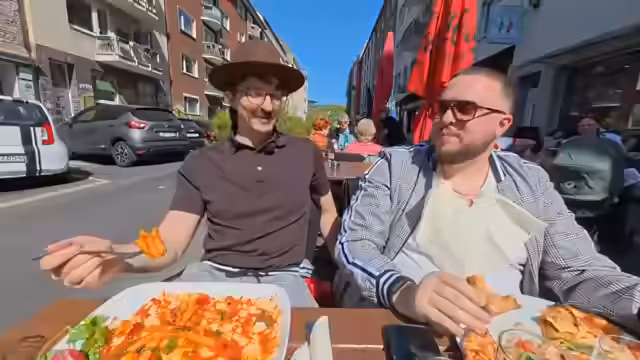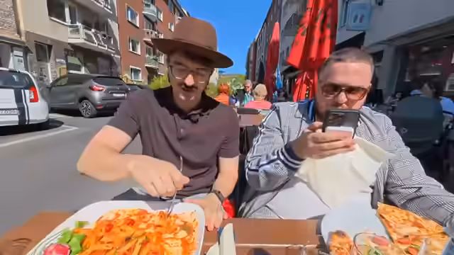 01:33:12Auf dem Weg zum Spielort treten die Präsidenten die Reise an und erleben zufällige Begegnungen, unter anderem mit einem Mann auf Lachgas. Sie diskutieren über Köln, das sie als stressig und überfüllt beschreiben, aber auch für seine Bewohner schätzen. Die Technik im Auto läuft reibungslos, und der Rucksack mit der Ausrüstung wird bewundert. Sie erreichen schließlich ihr Ziel, bereit für das erste Spiel.