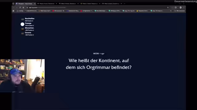 04:23:37Das Quiz schreitet mit immer schwierigeren und höherwertigen Fragen voran. Die Teilnehmer zeigen eine große Bandbreite an Wissen, was zu begeisterten Reaktionen bei richtigen Antworten und Frustration bei falschen führt. Die Punktestände schwanken stark, wobei die Nachtelfen in Führung gehen, während die Zwerge ins Minus rutschen. Der Streamer moderiert durch die Runde, gibt Hilfestellungen und kommentiert die Leistung der einzelnen Völker.