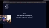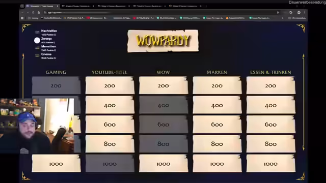 04:14:40Obwohl nicht alle angemeldet sind, beginnt das Quiz. Die Völker – Menschen, Gnome, Nachtelfen und Zwerge – werden nacheinander ausgewählt, um eine Frage aus einer von ihnen gewählten Kategorie und Punkthöhe zu beantworten. Die ersten Fragen betreffen Themen wie den Standort eines Dungeons in World of Warcraft, den Namen der Eule aus Harry Potter und die Wirbeltiergruppen. Die Zwerge starten mit einer Minuspunkte-Frage über Persien, was zu einer ersten Verärgerung führt.