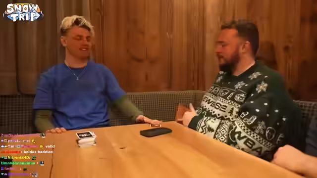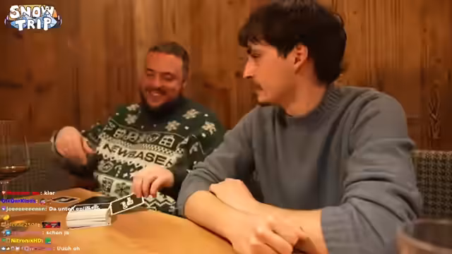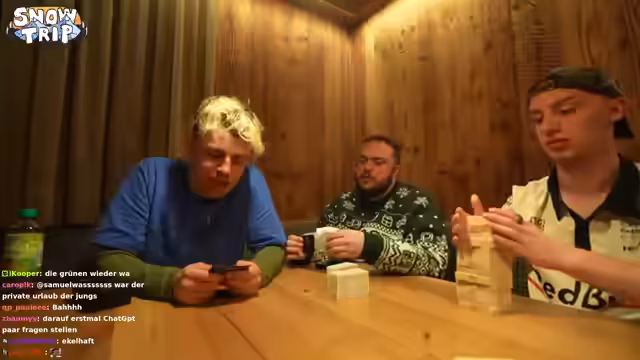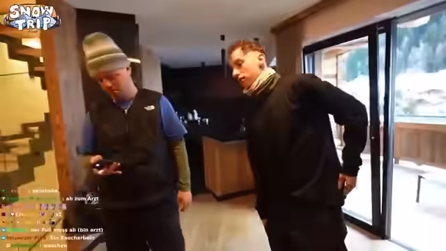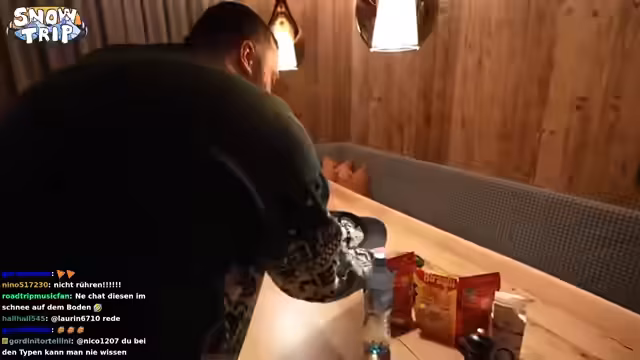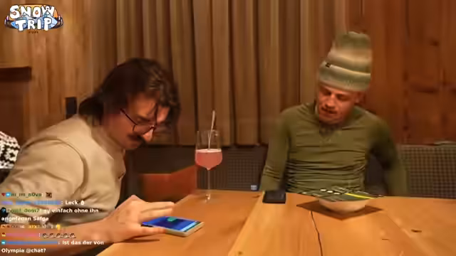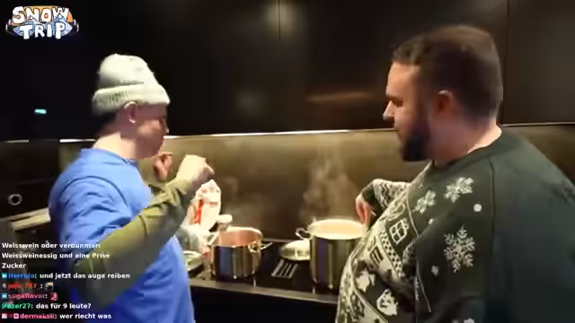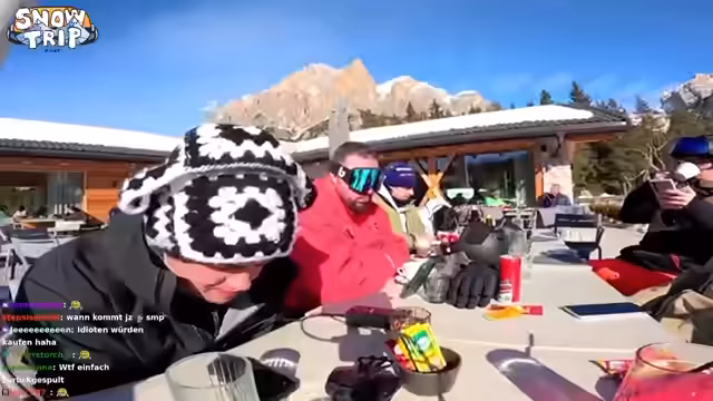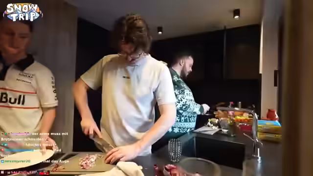 06:13:58Während der Vorbereitung werden persönliche Geschichten geteilt. Der Streamer erwähnt, dass seine Hose gerissen ist und eine mögliche Ursache dafür auf Snowbike-Aktivitäten zurückführt. Es wird über eine unklare Abbuchung von 3 Euro von der Apres-Ski-Bar gesprochen, wobei der Streamer vermutet, dass es sich um den Kauf eines Wassers handeln könnte. Die Kochsituation wird als chaotisch beschrieben, mit unklaren Aufgabenverteilungen und der Suche nach Küchenutensilien wie Brettern und Messern.