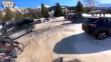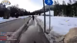03:55:50Nachdem die Gruppe an einem gefrorenen See angekommen ist, probieren sie einen Sprung über eine Lücke. Zögerlich und mit Argwohn testen sie die Dicke des Eises mit einem Stock. Nachdem sich gezeigt hat, dass das Eis stabil genug ist, springen sie nacheinander rüber. Der Streamer gibt selbstbewusst vor, der Mutigste zu sein, aber seine Freundin traut es sich, um ihn zu zeigen.
