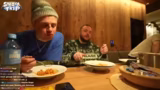05:41:57Die Stimmung wird kulinarisch, als die Gruppe das Abendessen vorbereitet. Es wird eine Wodka-Pasta gekocht, für die alle mithelfen müssen. Während des Kochens werden Rezepte diskutiert und die Zutaten überprüft. Die Atmosphäre ist locker und gesellig. Ein Teilnehmer bemerkt, dass Tomatenmark fehlt, was zu einem spontanen Einkaufsbummel führt, der von den Zuschauern im Stream begleitet wird.