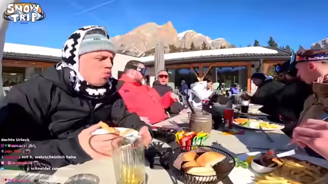01:15:30Die Snowbike-Tour endet nach anstrengender Fahrt an einem Bergrestaurant. Die Gruppe ist erschöpft und leidet unter Kopfschmerzen und anderen körperlichen Beschwerden. Im Restaurant wird die Karte begutachtet und lokale Spezialitäten wie Knödel und Spätzle erwähnt. Die Gruppe genießt eine verdiente Pause und stärkt sich, bevor die weitere Planung für den Abend, wie ein geplantes cozy cooking Stream, besprochen wird.
