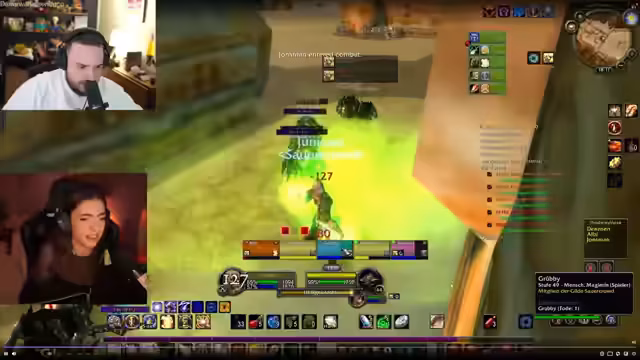 03:50:06Der Höhepunkt des Streams ist ein dramatischer Vorfall im Spiel, bei dem ein Gildenmitglied, Vlesky, innerhalb von Sekunden von Monstern überwältigt wird und stirbt, ohne es vorher zu realisieren. Dies löcht einen starken Eindruck bei den Zuschauern aus. Parallel dazu wird über einen humorvollen Clip von Grubby diskutiert, während der Streamer selbst auch einen unglücklichen Tod erlebt und seine Frustration über die technische Performance des Spiels zeigt.