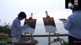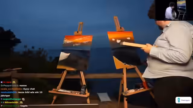 00:20:00Die Streamer malen im Freien, umgeben von Good Vibes, Wolken und gelegentlichem Regen. Sie unterhalten sich über die Schwierigkeiten des Malens im Freien, die Vorteile und wie sie mit den Elementen umgehen. Das Gespräch wechselt zwischen technischen Malproblemen und persönlichen Erlebnissen.