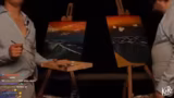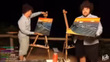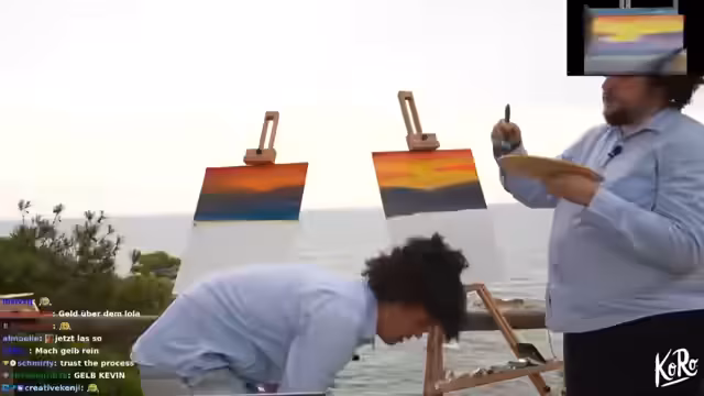 00:06:40Die Streamer beginnen mit dem Bob-Ross-Tutorial, stoßen jedoch auf Probleme: Das Tutorialvideo ist gesperrt, sie haben fehlende Farben wie Preußisch Blau, haben Probleme mit der Konsistenz der Farbe und der Techniken wie dem Tape-Verfahren. Die Leinwände müssen mehrmals überarbeitet werden.