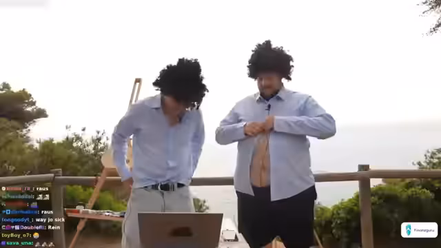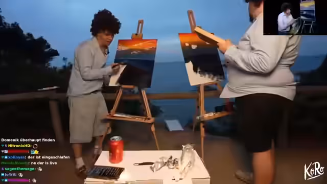 00:00:00Der Streamer und sein Dominik an einem geheimen Strand in Spanien, mit dem Ziel, ein Bob-Ross-Tutorial zu folgen. Sie richten zwei Staffeleien und Leinwände ein, wobei sie sich über das Tragen von Hemden und das Aussehen wie Bob Ross unterhalten. Es gibt technische Herausforderungen, wie das Abkleben von Markenlogos und das Setup einer VPN-Verbindung.