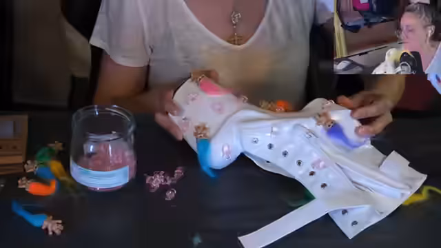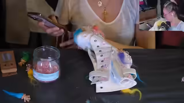 02:03:34Die Streamerin stellt das Konzept ihres Outfits, den 'Millennial Drip', vor. Dieses beinhaltet Paar Schuhe, die sie zu 'Millennial Boots' umgestalten möchte, indem sie sie mit persönlichen Gegenständen wie Plastik-Schnullern und Troll-Figuren beklebt. Dies ist als Hommage an ihre Kommentarspalte und als künstlerische Reaktion auf Hate und Flaming wegen ihres Alters gedacht. Das gesamte Outfit soll zeigen, dass Millennials auch im Alter sexy und göttlich sein können und Hass in Kunst umwandeln.