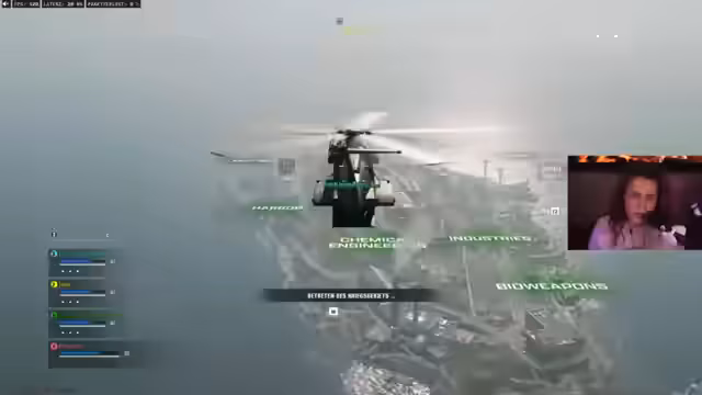 01:54:23Der Stream konzentriert sich auf das Gameplay von 'Call of Duty: Warzone'. Die Spielerin landet in der Zone 'Industries' und sucht nach einer geeigneten Waffe, stößt auf technische Probleme wie eine nicht abgeschlossene Mission und eine störende Drohne. Sie navigiert durch die Map, identifiziert Gegner, und kommuniziert mit ihrem Team über Standorte und bevorstehende Gefechte. Der Fokus liegt klar auf der taktischen Orientierung und dem Kampf ums Überleben.