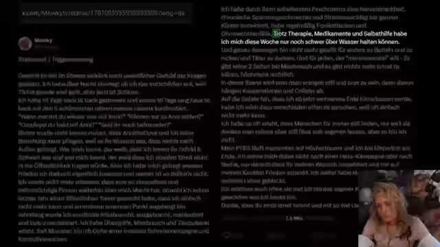 02:02:15Die Schilderung konzentriert sich auf die von Moki gemachten Aussagen über ihre psychische und physische Gesundheit, insbesondere die angebliche Trigeminus-Neuralgie und depressive Episoden. Es werden Widersprüche in den Erklärungen für die Auslöser dieser Krankheiten thematisiert, die sich ständig ändern, von Stress über das Finanzamt bis hin zu Botox. Zudem wird die nachträgliche "Genesung" von Depressionen als fragwürdig dargestellt und es wird die ethische Verpflichtung betont, die Erfahrungen von Menschen mit tatsächlich diagnostizierten psychischen Erkrankungen ernst zu nehmen, auch wenn einige wenige ihre Symptome vortäuschen.