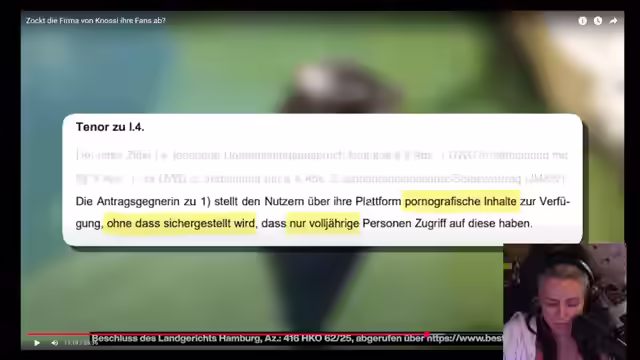 00:30:19Es wird ein Gerichtsbeschluss des Landgerichts Hamburg gegen FanBlast behandelt, der auf der Internetseite von Bestfans veröffentlicht wurde, einer ähnlichen Plattform für bezahlte Kommunikation mit Stars, hauptsächlich aus dem Erotikbereich. Bestfans wirft FanBlast irreführende Praktiken vor, da FanBlast den Nutzern suggeriere, mit den Stars persönlich zu kommunizieren, während die Kommunikation tatsächlich von Agenturen übernommen werde. Der Kurier Verlag veröffentlichte eine Pressemitteilung von Bestfans, die besagt, dass Bestfans darauf achte, dass die Nachrichten ausschließlich von den Creatorn selbst verfasst werden. Es wird vermutet, dass FanBlast versuche, den Eindruck zu erwecken, dass die Kommunikation direkt mit den Creatorn stattfindet, um Kosten zu sparen. Das Gericht wirft FanBlast vor, den Nutzern vorzugaukeln, sie würden die private Telefonnummer des Stars erwerben und dass der Star online und zur Beantwortung von Nachrichten bereit sei, obwohl dies nicht der Fall sei. Zudem werden Bedenken hinsichtlich des Zugangs zu pornografischen Inhalten für Minderjährige, der allgemeinen Geschäftsbedingungen und des Datenschutzes geäußert.