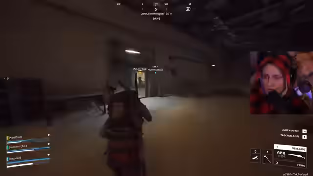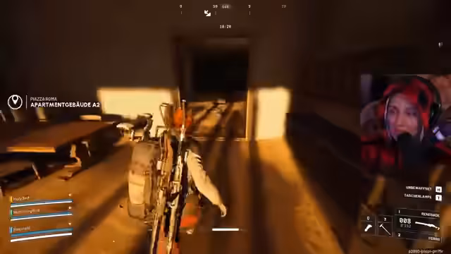 02:37:08Ein Spieler fällt vom mittleren Teil des Gebäudes herunter, ist aber sehr 'low' und kann die anderen retten. Es wird erklärt, dass man von einem Mittelteil herunterfallen kann, um Loot zu finden, und von dort aus weiter nach rechts springen kann. Die Rettungsaktion wird als lebensmüde bezeichnet, da man sich erneut in Gefahr begibt. Die Gruppe wird wiederbelebt und muss sich vor kommenden Gegnern verstecken. Es wird festgestellt, dass die Gegner entdeckt wurden, aber nicht schießen. Ein Geräusch wird gehört, und es wird versucht, von dem Dach herunterzukommen, da es keinen offensichtlichen Weg nach unten gibt. Ein Spieler schafft es, sich festzuklammern und von einer Seite auf die andere zu springen, was als aufregend empfunden wird. Es wird Vertrauen in die eigenen Skills gefordert, aber auch die Schwierigkeit, sich an der Leiter festzuhalten, wird erwähnt. Da alles bereits gelootet wurde, wird überlegt, zu extrahieren. Es wird zu einem orangefarbenen Marker gegangen, wobei Vorsicht vor Kameras geboten ist. Eine Leiter/Treppe wird genommen, aber es wird festgestellt, dass, wenn man einen Gegner anschießt, gleich 500 andere kommen. Es wird nach kostenlosen Gegenständen in dem 'Kaff' gesucht, und es wird gewarnt, dass oben Gegner sind.